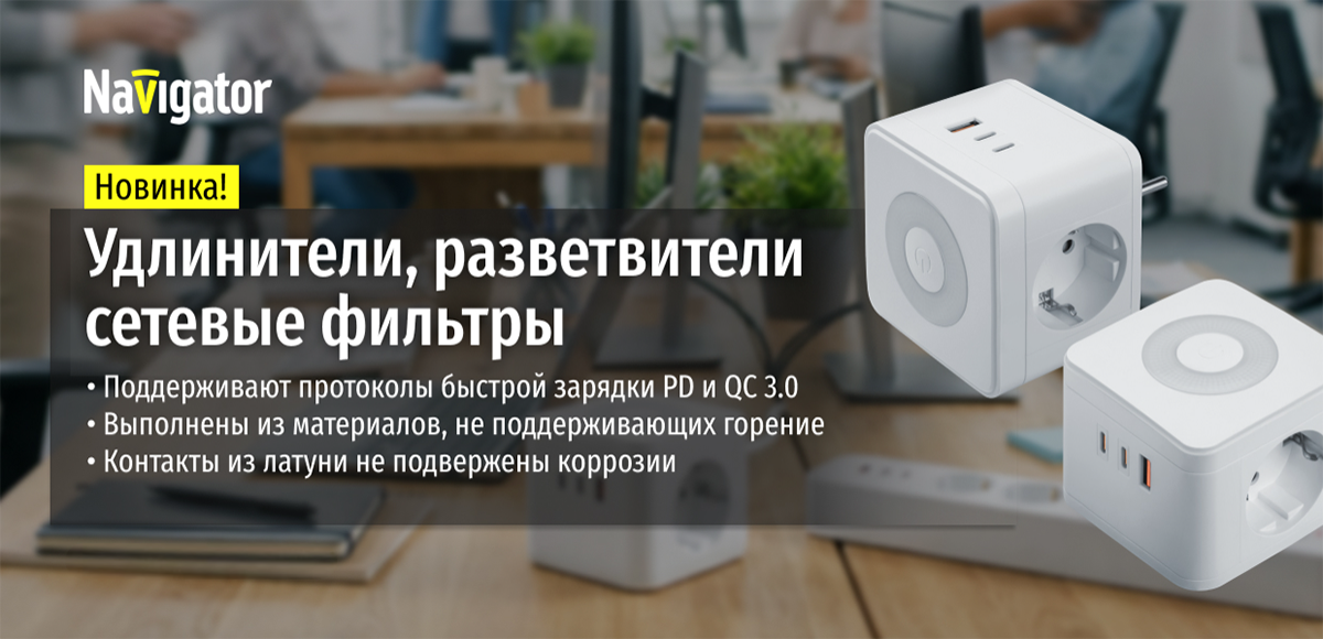 Новинки разветвителей, сетевых фильтров и удлинителей Navigator с поддержкой быстрой зарядки PD и QC 3.0 идеально подходят для дома и офиса, удобны и безопасны в использовании.