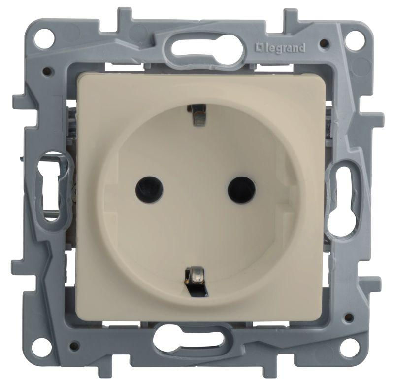 Представляет собой одноместный модуль розетки, со стороной 71 мм, с защитным контактом стандарта SCHUKO. Изготовлен из пластика, цвета слоновой кости, со шторками. Монтируется под штукатурку.