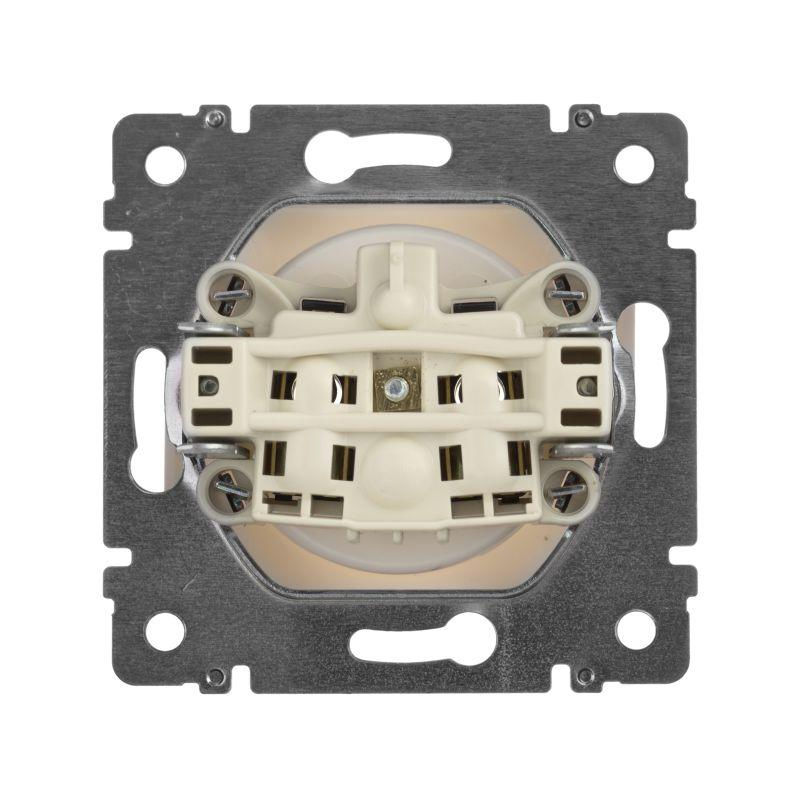 Представляет собой одноместный модуль розетки, со стороной 70,9 мм, без защитного контакта. Изготовлен из пластика, с необработанной поверхностью, белого цвета. Монтируется под штукатурку.