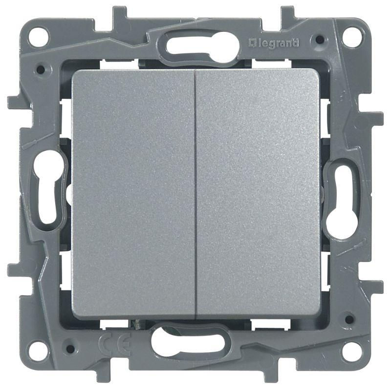 Представляет собой механизм переключателя с двумя клавишами. Цвета "алюминий". Изготовлен из пластика. Монтируется под штукатурку.