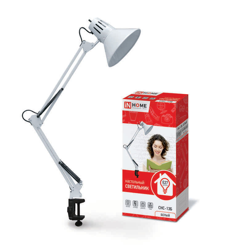 Светильник настольный под лампу СНС 13Б на струбцине 60Вт E27 230В бел. (коробка) IN HOME 4690612012728