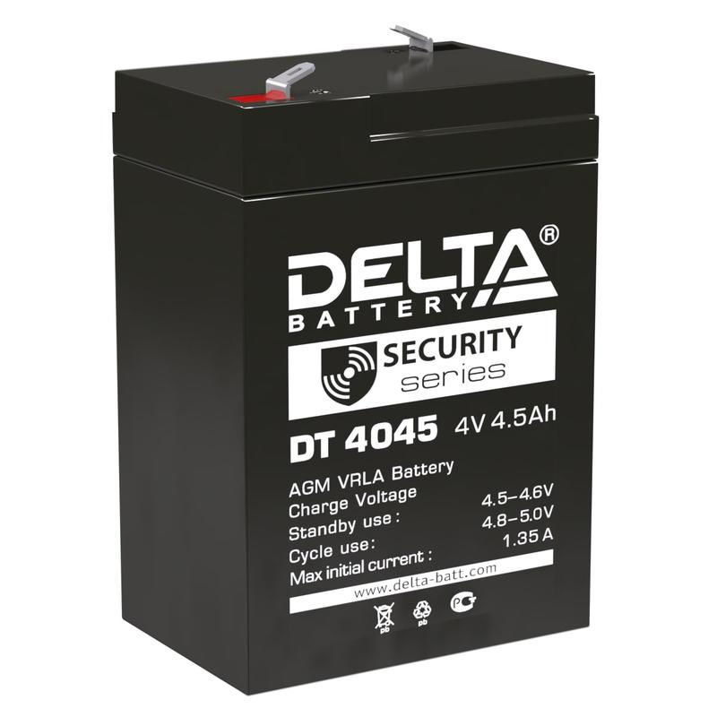 Аккумуляторная батарея Delta DT 4045. Напряжение 4В, емкость 4,5Ач. Имеет низкое внутреннее сопротивление и высокую плотность энергии. Предназначена для охранно-пожарных систем и СКУД. Срок службы 5 лет.