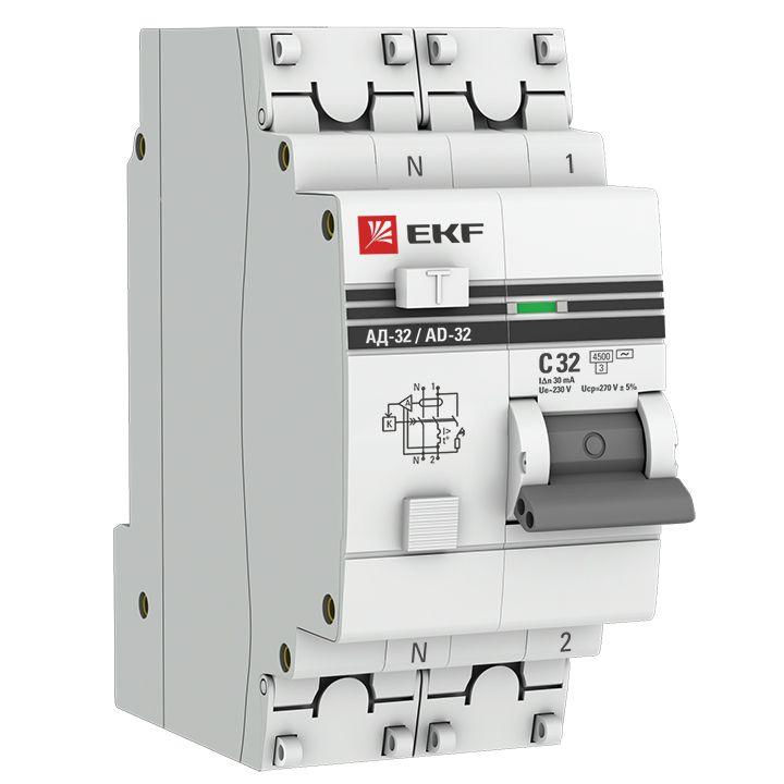 Выключатель автоматический дифференциального тока 2п (1P+N) C 32А 30мА тип AC 4.5кА АД-32 2мод. защита 270В электрон. PROxima EKF DA32-32-30-pro