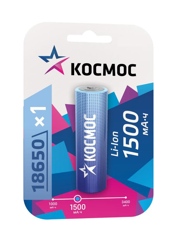 Аккумулятор Li-ion 18650 1500мА.ч без защиты (блист.1шт) КОСМОС KOC18650Li-ion15UBL1