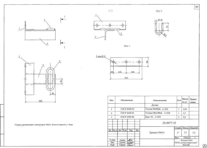 Траверсы серии ТМ-161, 26.0077  предназначены для строительства ЛЭП 10 кв. с защищенными проводами. Для изготовления всех деталей используется сталь Ст3.  вес 7,5кг. размер Д352*В300 мм. Основной задачей данного элемента является обеспечение  крепления проводов, необходимого при установке опор для низковольтных и высоковольтных линий (при напряжении номинальном 0,4-35 кВ). Крепление траверсы на опоре выполняется хомутом, типоразмер которого выбирается в зависимости от вида опоры. Наша компания - один из ведущих производителей металлоконструкций для ЛЭП на территории Краснодарского края. Рады будем сотрудничеству! Позвоните нам сегодня и оформите выгодный заказ!