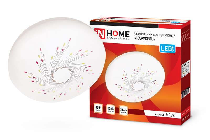 Светодиодные светильники КАРУСЕЛЬ серии DECO от ТМ In Home в классическом белом матовом корпусе с яркими цветовыми акцентами добавят нотку жизнерадостности в интерьер любого помещения. Линейка светильников КАРУСЕЛЬ представлена в трех размерах от 190 до 350 мм. Несколько вариаций мощности (в диапазоне от 12 Вт до 36 Вт) позволяют подобрать оптимальный осветительный прибор, в зависимости от конфигурации и габаритов помещения. Применение Светодиодные светильники КАРУСЕЛЬ серии DECO предназначены для внутреннего освещения жилых помещений, подъездов и сферы ЖКХ, офисных и административных учреждений, магазинов, а также холлов, коридоров, лестничных пролётов, подсобок и других помещений вспомогательного назначения. Преимущества Современные светильники серии DECO, работающие на основе последнего поколения светодиодов, обеспечивают яркий равномерный световой поток при максимальной экономии электроэнергии. Отсутствие пульсации гарантирует сохранность здоровья глаз. Светодиодные светильники являются одним из самых экологически безвредных источников света и не требуют специальной утилизации и переработки. Светильники получили сертификат таможенного союза EAC. Производятся по ГОСТу Р МЭК 60598-1-2011. Монтаж Светодиодные светильники серии DECO применяются для работы в сетях переменного тока напряжением 230В ± 10% с частотой 50 герц. Перед установкой следует убедиться в правильности напряжения питающей сети и наличии защитного устройства в цепи (автоматический выключатель, предохранитель). Этапы установки: отключите сетевое напряжение, извлеките светильник из упаковки, открутите плафон светильника, повернув его по часовой стрелке. Через клеммную колодку подключите подготовленные концы проводов осветительного прибора к проводу сети. Установите светильник на поверхности и зафиксируйте при помощи дюбелей и саморезов. Сборку светильника следует осуществлять в обратной последовательности.