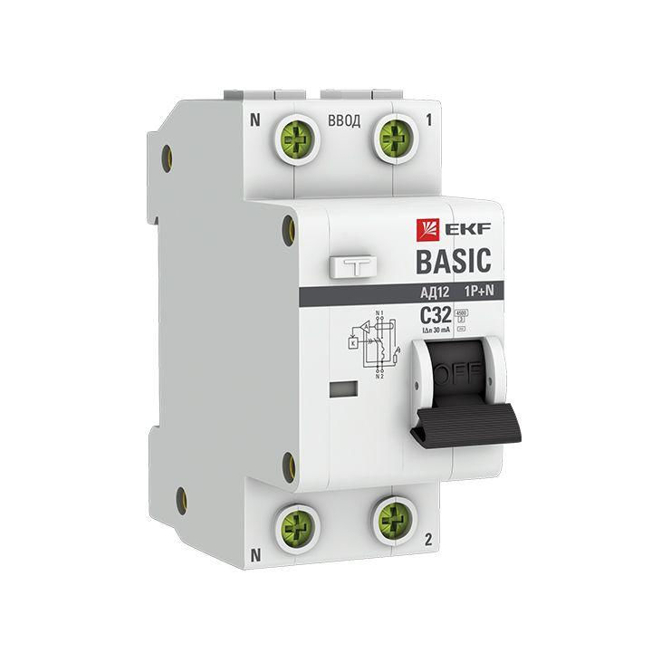 Выключатель автоматический дифференциального тока 2п (1P+N) C 32А 30мА тип AC 4.5кА АД-12 Basic EKF DA12-32-30-bas