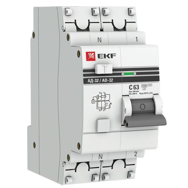 Выключатель автоматический дифференциального тока 2п (1P+N) C 63А 100мА тип AC 4.5кА АД-32 защита 270В электрон. PROxima EKF DA32-63-100-pro