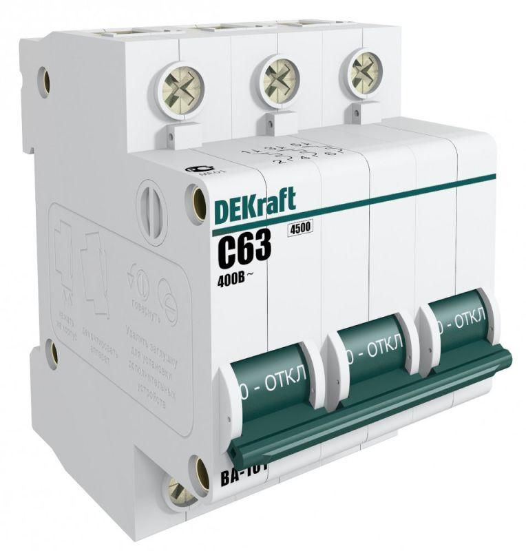 Автоматический выключатель серии ВА-101 DEKraft; 3P; номинальный ток 63 А; характеристика С; отключающая способность 4,5 кА. Новый механизм расцепления мгновенно разрывает цепь при возникновении аварии. 5 монолитных заклепок повышают прочность корпуса аппарата. Сплошная лицевая панель обеспечивает безопасность эксплуатации аппарата. Боковые каналы охлаждения повышают стабильность работы при высоких температурах окружающей среды. Полностью автоматизированный контроль качества производства.