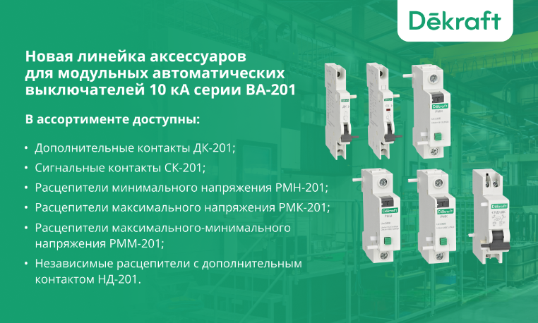Линейка автоматических выключателей ВА-201 10 кА от Dekraft стала ещё функциональнее! Мы расширяем её возможности — в продаже появились новые аксессуары, которые значительно повышают уровень защиты, мониторинга и удобства управления электрическими сетями.